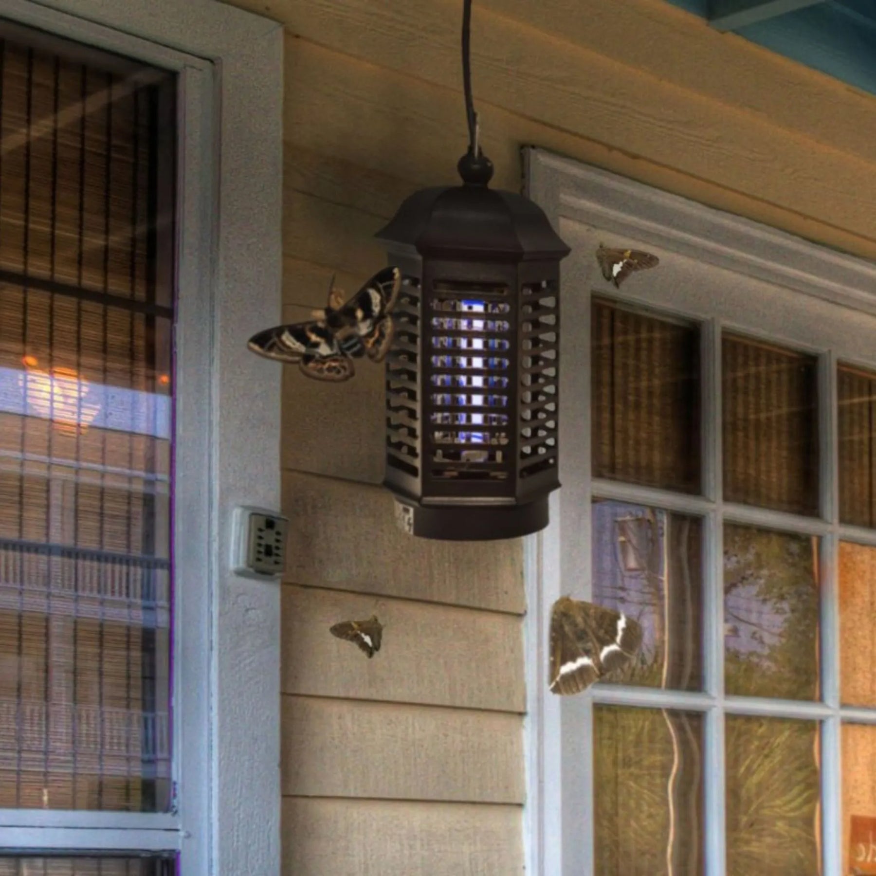 O seu sistema combina uma lâmpada de luz ultravioleta (luz negra) que atrai os insetos com uma grelha elétrica de baixa voltagem que os elimina imediatamente ao contacto.